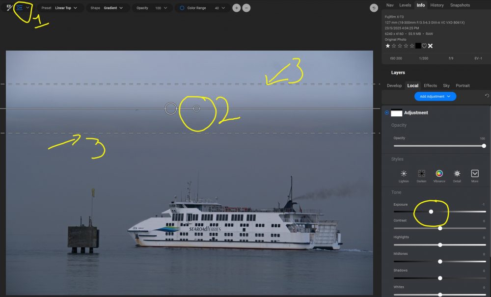 We are using the local adjustments again, like we did last week, so click on Add Adjustment. However, this time we don’t want the brush. If you look at number 1, you can see I have circled the tool next to the brush, so click on that. Then go to the slider and move the exposure one to the left because we want this darker.