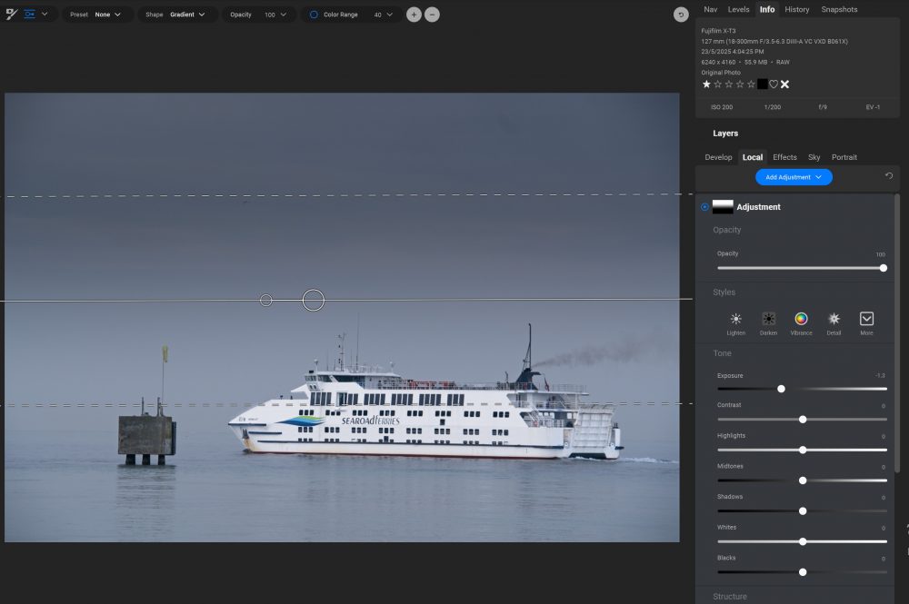 I could have finished it there, but I ended up adding another gradient to the bottom of the image as well. Not as big because I didn’t want it to impact the ferry. If you want to do that, you should be able to work it out now.