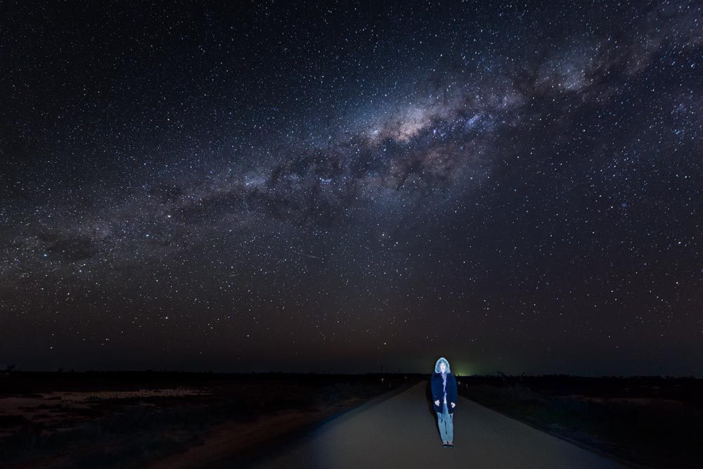 The above image was the last one we took for the night.  I showed a photo the other day of someone shining a torch to light up the Milky Way, and this is the person who did it.  I asked her to just stand in the road, and we lit her up.  The light we used was a little too strong, so I had to work on that, but I don’t mind the results.  Playing with the light turned out to be a lot of fun.