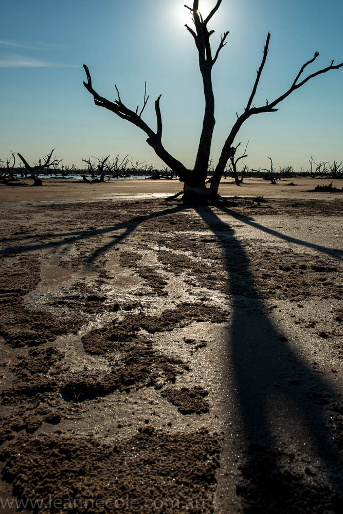 The conditions out at the salt pans. It wasn’t as hot there as it had been at the old house.  It was a very bright sun, and since it was behind the lakes, it meant we had to take photos into the sun,  so getting shadows of the dead trees seemed a logical thing to do.  The trees were lots of odd shapes.